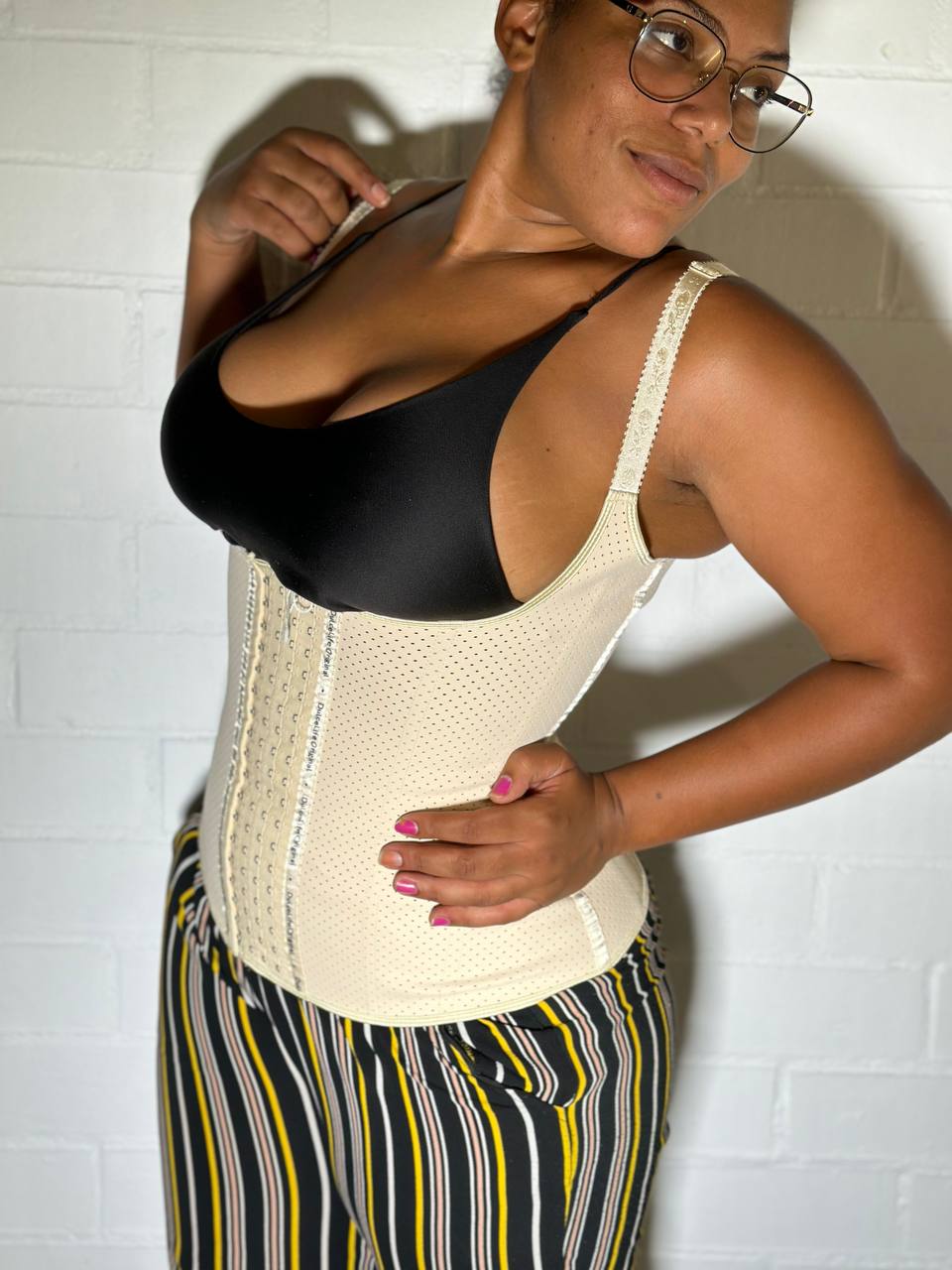 Faja reductora tipo chaleco con tirantes 100% látex con 4 hileras de ganchillos de acero y 17 varillas flexibles de soporte.